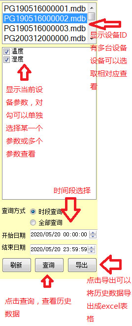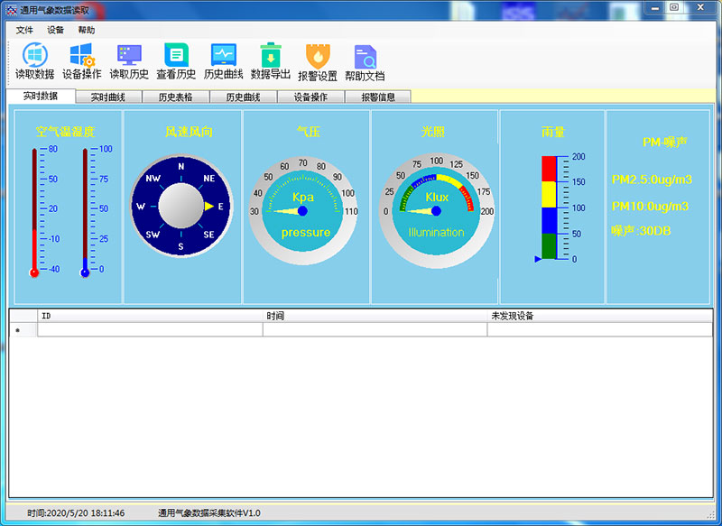 點擊右側的刷新,在串口號后面選擇剛才查看到的COM口號,點擊查找,此時軟件會識別到設備信息,并在左側顯示出來。①讀取數據,可以觀察到傳感器的實時數據。②讀取歷史數據:點擊讀取歷史可讀取歷史數據