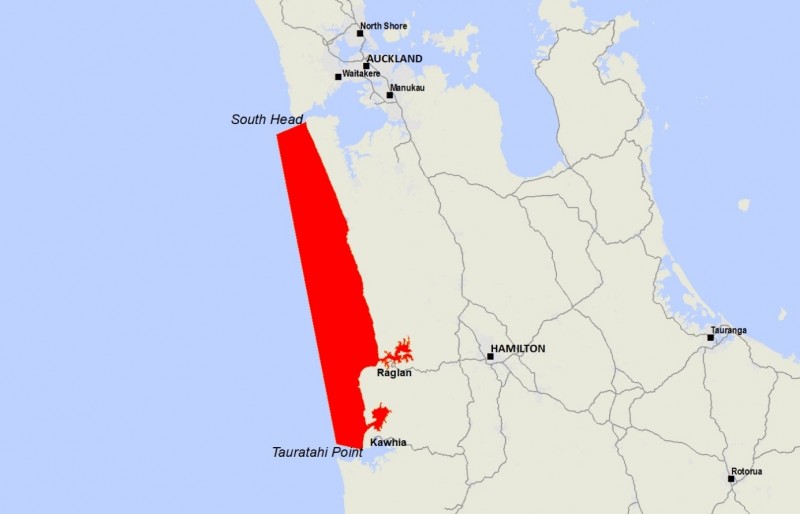 新西蘭MPI建議消費者不要采集和食用從從南岬(South Head)到西海岸北島陶拉塔希角(Tauratahi Point)的貝類。該海域受檢貝類的麻痹性貝類毒素含量高于0.8mg/kg的安全限量,存在食用風險。受影響區域如下圖: